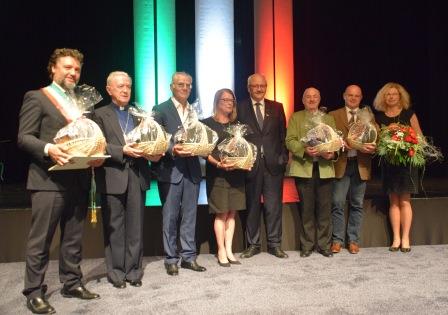 Dr. Paolo Niccoletti, Bürgermeister aus Loreto (links) erhielt zusammen mit S. E. Giovanni Tonucci, Erzbischof aus Loreto (rechts) von Erstem Bürgermeister Herbert Hofauer die "Goldene Ehrennadel" der Kreisstadt Altötting.