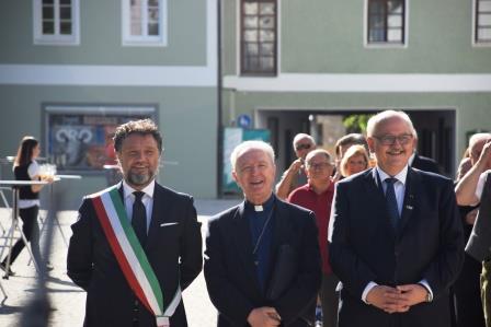 Sichtlich erfreut zeigten sich die Gäste über den schönen Empfang auf dem Vorplatz der Kultur+Kongress Forum Altötting. v. links: Dr. Paolo Niccoletti, Bürgermeister aus Loreto, S. E. Giovanni Tonucci, Erzbischof aus Loreto zusammen mit Ersten Bürgermeister Herbert Hofauer.