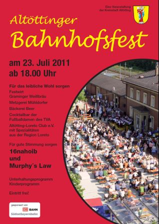 Es ist wieder so weit: Am Samstag, 23. Juli 2011, ab 18.00 Uhr, findet das 4. Altöttinger Bahnhofsfest statt. Alle zwei Jahre im Wechsel mit dem Stadtfest, hat sich das Bahnhofsfest mittlerweile einen festen Platz im Altöttinger Festkalender erkämpft. 2005 als Einweihungsfeier des neu gestalteten Bahnhofsvorplatzes gestartet, erfreut sich das „kleine Stadtfest“ vor allem bei den Altöttinger Bürgerinnen und Bürgern großer Beliebtheit. <?xml:namespace prefix = o ns = "urn:schemas-microsoft-com:office:office" /><o:p></o:p>