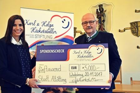 Am 20. November 2017 konnte Erster Bürgermeister Herbert Hofauer aus der Hand von Petra Höcketstaller einen Spendenscheck in Höhe von 5.000 € der Karl & Helga Höcketstaller-Stiftung entgegennehmen, der für bedürftige Kinder in der Kreisstadt Altötting Verwendung finden soll. Die Spende wird im Rahmen unserer Aktion „Bürger helfen Bürgern“ noch vor Weihnachten an die Kinder weitergeleitet. Einen herzlichen Dank für diese mehr als großzügige Spende!