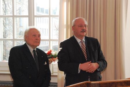 v. links: Altlandrat und Ehrenbürger der Kreisstadt Altötting, Seban Dönhuber, zusammen mit Ersten Bürgermeister Herbert Hofauer beim offziellen Geburtstagsempfang im Großen Sitzungssaal des Altöttinger Rathauses.