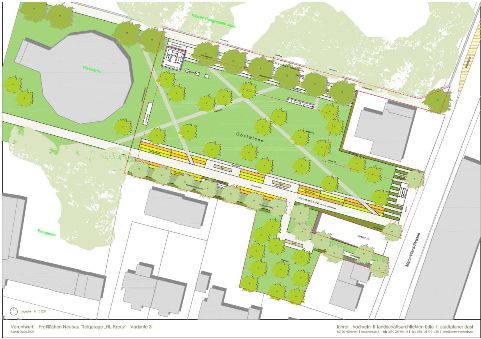 Es sieht vor, dass jeweils nördlich und südlich Promenaden verlaufen und dazwischen eine Obstwiese mit Verbindungswegen angelegt wird. Vielblütige Staudenbeete und Schnitthecken runden die Gestaltung des Parks ab.