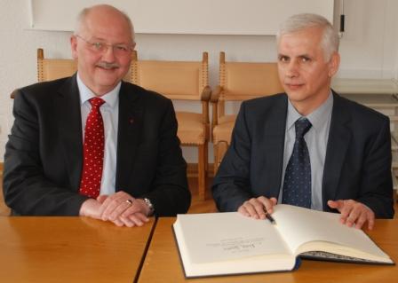 v. links: Erster Bürgermeister Herbert Hofauer, Sidik Spahic, Konsul des Generalkonsulats von Bosnien und Herzegowina in München, beim Eintrag in das "Goldene Buch" der Kreisstadt Altötting. (Foto: Stadt Altötting)