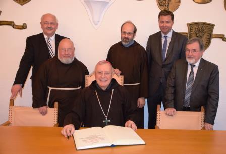 v. links: Erster Bürgemeister Herbert Hofauer, Guardian Pater Norbert Schlenker, S. E. Bischof Dr. Paul Hinder, Provinzialminister Bruder Marinus Parzinger, Bundestagsabgeordneter Stephan Mayer, und stellv. Landrat Stefan Jetz beim Eintrag in das "Goldene Buch" der Kreisstadt Altötting.