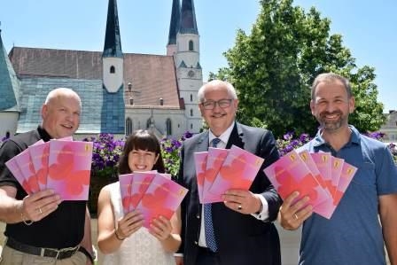 v.l.n.r. Gerd Loichinger von der Stadtverwaltung, Jugendpflegerin Kathrin Jira, Erster Bürgermeister Herbert Hofauer und Jugendreferent Stephan Antwerpen bei der Präsentation des neuen Ferienpasshefts.