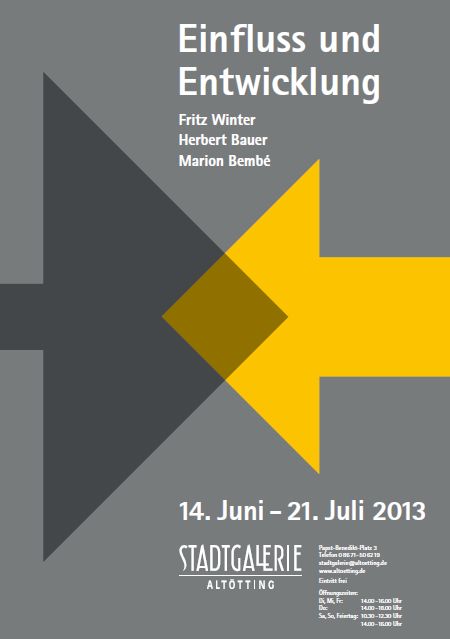 Ab dem 14. Juni 2013 sind in der Stadtgalerie Altötting Bilder von Fritz Winter, Herbert Bauer und Marion Bembé zu sehen. Fritz Winter gilt als einer der wichtigsten Vertreter der Abstrakten Malerei Deutschlands, seine beiden Meisterschüler Herbert Bauer und Marion Bembé haben beide bei Prof. Winter in Kassel studiert.