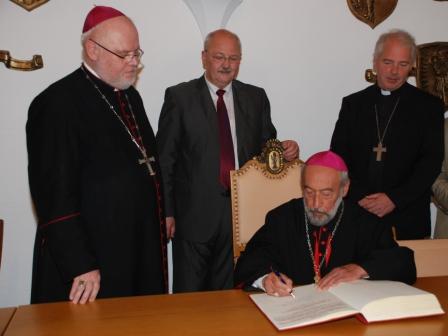 Erster Bürgermeister Herbert Hofauer empfing am <?xml:namespace prefix = st1 ns = "urn:schemas-microsoft-com:office:smarttags" /><st1:date ls="trans" Month="8" Day="7" Year="2010">7. August 2010</st1:date> S. E. Erzbischof Dr. Reinhard Marx, Erzbischof des Erzbistums München und Freising, S. E. Erzbischof Dr. Flavien-Joseph Melki, Erzbischof der Syrisch-antiochenisch-katholischen Kirche und Großkanzler des Syrisch-katholischen Patricharchats Beirut (Libanon) und S. E. Bischof Dr. Everard Johannes de Jong, Niederländischer Jugendbischof, im Großen Sitzungssaal des Altöttinger Rathauses. Die hochrangigen Gäste kamen anlässlich des 15. Internationalen Forums Altötting der Gemeinschaft Emmanuel in die Wallfahrtsstadt Altötting. In Anwesenheit der Organisatoren und der Verantwortlichen der Gemeinschaft Emmanuel trugen sich die hochrangigen Gäste in das „Goldene Buch“ der Stadt Altötting ein.