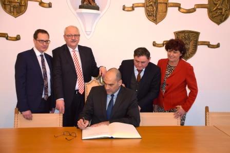 v. links: Landtagsabgeordneter Dr. Martin Huber, Erster Bürgermeister Herbert Hofauer, Dr. Dan Shaham, Generalkonsul des Staates Israel, Landrat Erwin Schneider sowie Landtagsabgeordnete Ingrid Heckner ein Eintrag in das "Goldene Buch" der Kreisstadt Altötting.