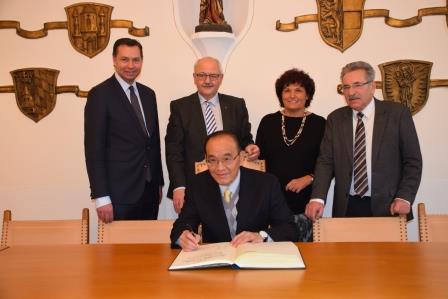 Der Leiter der Taipeh-Vertretung in München, Generaldirektor Tsong-Ming Hsu, beim Eintrag in das "Goldene Buch" der Kreisstadt Altötting