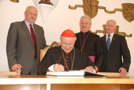 Im Anschluss an den Festgottesdienst in der Stiftspfarrkirche empfing Erster Bürgermeister Herbert Hofauer den Ehrengast zusammen mit zahlreichen weiteren geladenen Gästen im Großen Sitzungssaal des Altöttinger Rathauses. Nach der Begrüßung durch den Ersten Bürgermeister und einem herzlichen Grußwort von S. E. Erzbischof Prof. Dr. Kothgasser trug sich der Ehrengast in das „Goldene Buch“ der Kreisstadt Altötting ein.