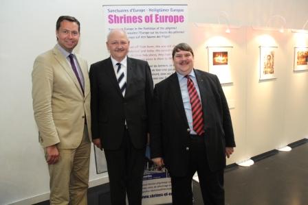 Bundestagsabgeordneter Stephan Mayer, Erster Bürgermeister Herbert Hofauer zusammen mit Europaabgeordnetem Bernd Posselt vor der Ausstellung "Shrines of Europe" im Europapalament in Straßburg.