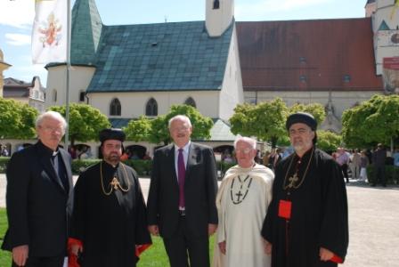 Erster Bürgermeister Herbert Hofauer (Mitte) mit Seiner Exzellenz Erzbischof Silvanus Petros Al-nemeh, Metropolitan von Homs und Hama (Syrisch-orthodoxe Kirche) und Seiner Exzellenz Erbischof Eustathius Matta Roham, Erzbischof von Jazirah und Euphates (Syrisch-orthodoxe Kirche von Antiochien - Hassake, Syrien) in Begleitung von zwei Angehörigen der "Weissen Väter".</o:p>