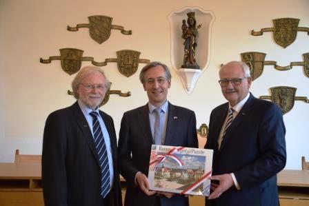 von links: Helmut Tiefenthaler, Vorsitzender der Europa-Union Kreisverband Altötting, der Generalkonsul der Französischen Republik in Bayern, Jean-Claude Brunet, Erster Bürgermeister Herbert Hofauer (Foto:Stadt Altötting)