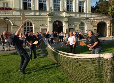 Vier Spieler beim Vorführen des "Speckbrettlsports".