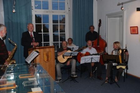 Erster Bürgermeister Herbert Hofauer (2. von links) eröffnet die Ausstellung, die musikalisch umrahmt wurde von Rudi Haghuber (3. von links) und der Lehrercombo der Berufsschule Altötting