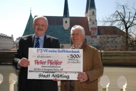 Erster Bürgermeister Herbert Hofauer übergibt Peter Pfeifer den Gewinner-Scheck in Höhe von 500.- €.<?xml:namespace prefix = o ns = "urn:schemas-microsoft-com:office:office" /><o:p></o:p>