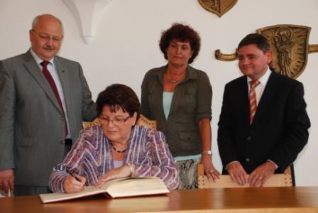v. links: Erster Bürgermeister Herbert Hofauer, Barbara Stamm, Präsidentin des Bayerischen Landtags, Ingrid Heckner, Landtagsabgeordnete, sowie Landrat Erwin Schneider beim Eintrag in das "Goldene Buch" der Stadt Altötting.