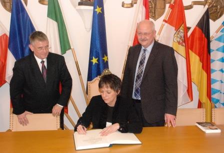 v. links: Hans-Ulrich Thoma, evangelischer Pfarrer in Altötting, Prof. Dr. theol., Dr. h. c. Margot Käßmann zusammen mit Ersten Bürgermeister Herbert Hofauer beim Eintrag in das "Goldene Buch" der Kreisstadt Altötting.