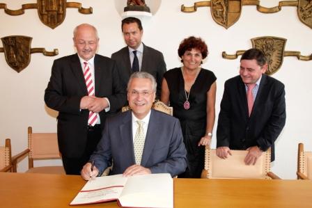 vorne im Bild: Joachim Herrmann, Bayerischer Staatsminister des Innern beim Eintrag in das "Goldene Buch" der Kreisstadt Altötting.