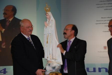 v. links: Erster Bürgermeister Herbert Hofauer übergibt Bürgermeister Dr. Vitor Manuel Jesus Frazão (Ourèm/Fatima) eine Replik der Madonna von Fatima.