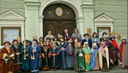 Am 01.01.2012 fand der traditionelle Empfang für die Sternsingerinnen und Sternsinger aller Pfarreien der Kreisstadt Altötting und der Kreisklinik im Großen Sitzungssaal des Rathauses statt. Erster Bürgermeister Herbert Hofauer begrüßte zusammen mit Kaplan Dominik Flür und Provinzoberin Schwester Hedwig Cichy vom Provinzhaus Heilig Kreuz als Vertreterin des Kindermissionswerkes die Sternsinger der einzelnen Pfarreien und der Kreisklinik und überreichte ihnen einen kleinen Geldbetrag als Startkapital. Er danke den Mädchen und Jungen für ihren wichtigen Einsatz. Im Anschluss an diesen Empfang schrieben die Sternsinger das Rathausportal mit dem Sternsingerspruch 20 + C + M + B + 12 an.