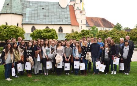 Erster Bürgermeister Herbert Hofauer empfing am 28. April 2014 im Großen Sitzungssaal des Altöttinger Rathauses 34 Austauschschülerinnen und -schüler mit ihren Lehrkräften Katalin Orban-Kerekes und Csilla Gjurász aus der ungarischen Stadt Esztergom. Die Stadt Esztergom liegt in Nord-Ungarn direkt an der Donau an der Grenze zur Slowakei. Organisiert wird der Schüleraustausch von den Maria-Ward-Schulen Altötting unter der Leitung von Petra Heigenmoser und Franz Becher,er findet heuer bereits zum sechsten Mal statt. Erster Bürgermeister Herbert Hofauer erzählte den ungarischen Gästen über die wechselvolle Stadtgeschichte von Altötting, zur Erinnerung wurde dem Kapellplatz noch ein Foto gemacht. Die Gäste bleiben noch bis zum 4. Mai in Altötting, um die bayerische Lebensart und Kultur kennenzulernen, außerdem werden in den nächsten Tagen noch Ausflüge zum Chiemsee und zum Bayernpark nach Reisbach unternommen. <o:p></o:p>