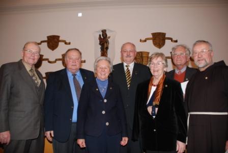 (v. links: Hans Joachim Strauß, Stadtrat a. D. Peter Becker, Walburga Coulon, Erster Bürgermeister Herbert Hofauer, Helga Antwerpen, Dr. Gebhard Streicher, Pater Präses Heinrich Grumann)