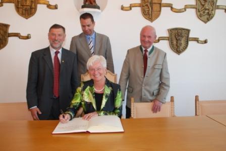 Die Vizepräsidentin des Deutschen Bundestages, Frau Gerda Hasselfeldt MdB, hat am Mittwoch, 3. Juni 2009, den Landkreis Altötting besucht und dabei auch der Kreis- und Wallfahrtsstadt Altötting eine Visite abgestattet. Im Rahmen eines festlichen Empfanges im Großen Sitzungssaal des Rathauses wurde sie von Zweitem Bürgermeister Wolfgang Sellner begrüsst. Nach dem Grußwort von MdB Stephan Mayer und sehr persönlichen Dankesworten der Vizepräsidentin hat sich Frau Gerda Hasselfeldt in das Goldene Buch der Stadt Altötting eingetragen.